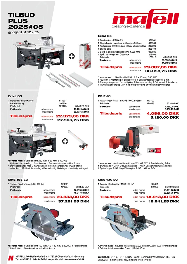 Der er p.t. et pænt udvalg af de gængse Mafell maskiner og tilbehør på lagret. Skriv eller ring på 25 33 99 58, så du sikrer dig at investere i det rigtige værktøj første gang.